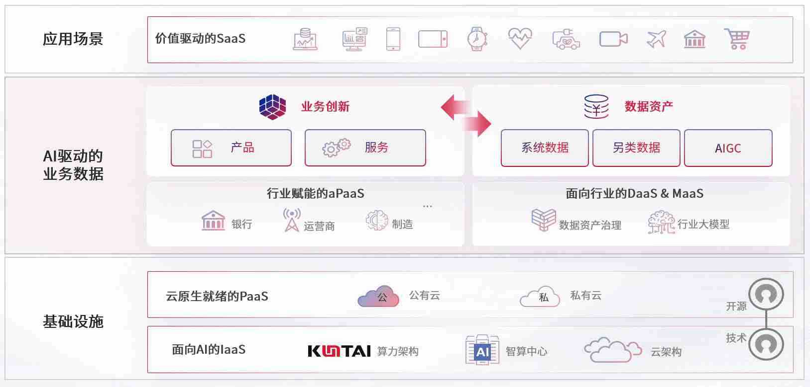 数字时代,,,,围绕企业数字化转型的关键要素,,,,V8娱乐数码开创性的提出数云融合战略和技术体系框架,,,,着力在云原生、、、、数字原生、、AI原生和信创产业上架构产品和服务能力,,,为处在不同数字化转型阶段的快消零售、、、、汽车、、金融、、、、医疗、、政企、、、教育、、、、运营商等行业客户提供泛在的敏捷IT能力和融合的数据驱动能力,,构建跨界融合创新的数字业务场景和新业务模式,,助力企业级客户建立面向未来的核心能力和竞争优势,,全面推动社会的数字化、、、、智能化转型升级。。。