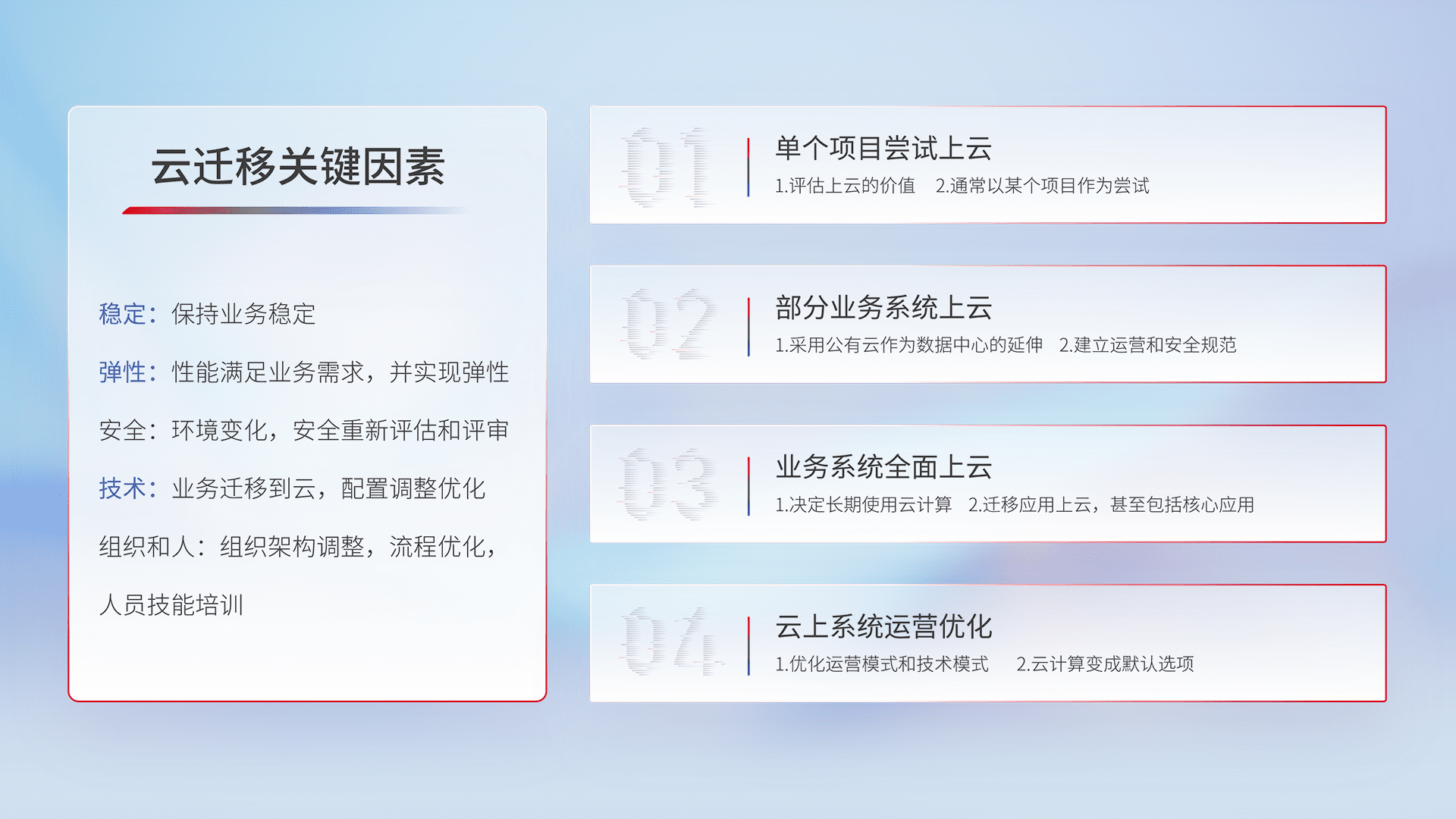 结合实际业务,,从规划设计、、、、云平台选型、、、、云原生改造、、、数据迁移、、、、集成交付,,迁移全过程为客户识别最佳上云路径,,做好风险识别管理,,,设计网络架构、、、、身份权限、、、、安全审计合规、、、、操作审计、、、日志审计、、监控告警策略、、、多站点容灾设计等,,对云上基础设施进行整体规划,,提升IT治理水平,,,,以满足弹性、、、、高可用、、、、高性能的需求。。