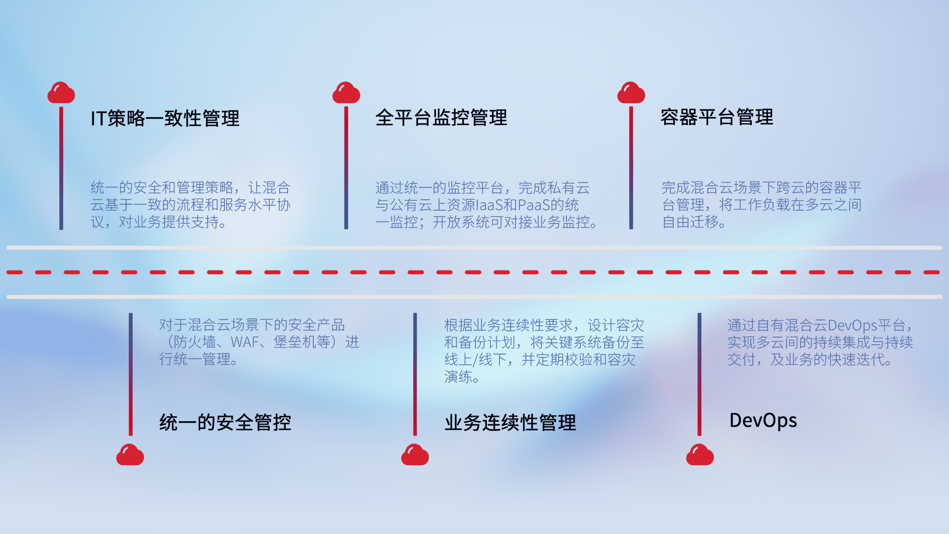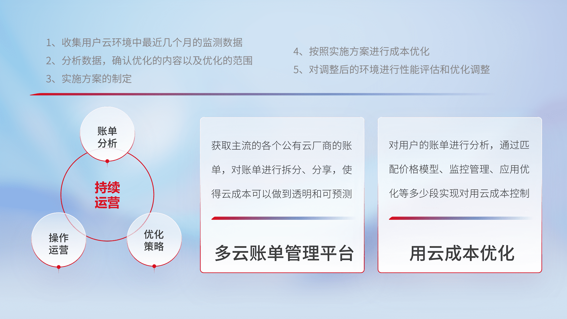 通过多云纳管,,,以统一的资源数据模型把客户的云资源进行抽象和封装,,,,进而实现对多云资源的统一操作,,保障云资源管理的可靠性、、稳定性与可用性。。。量身定制化运维内容,,,配置、、、、开发运维、、补丁管理、、、备份、、、、监控、、、认证和访问管理、、审计和日常巡检等,,保障在用云过程中的可靠度,,,稳定度以及高可用率。。